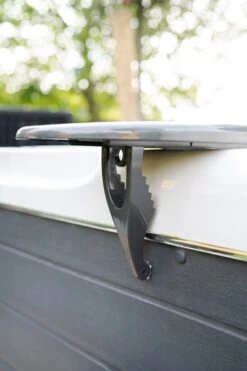 Aan de onderzijde van de Life Spa tray table zit een klem die je gemakkelijk in breedte kunt verstellen. Zo zit het dienblad altijd stevig op de rand van jouw opblaasbare- of vaste spa bevestigd. Voor de montage zijn geen schroeven nodig en aan de onderkant van het Life Spa dienblad vind je ook 2 beschermingsstrips. Hierdoor blijft jouw spa beschermd en hoef je niet in de ombouw te schroeven.